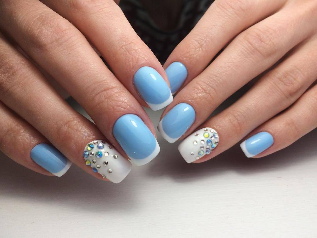 Маникюр в голубых и бирюзовых тонах прекрасно гармонирует со стразами, блестками, лепкой, френчем и бело-голубыми аккуратными рисунками.