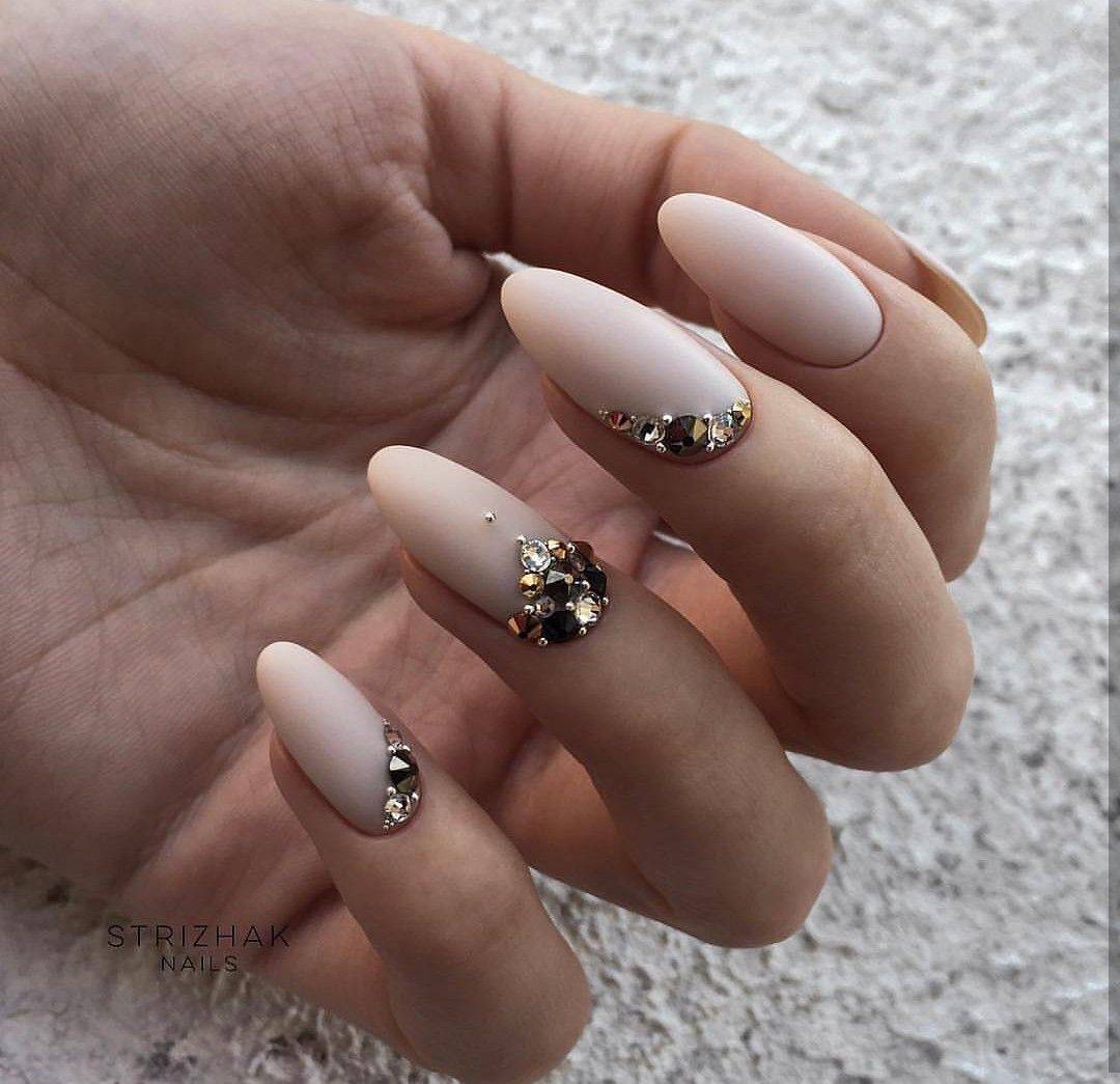 Маникюр с камнями просто шикарно смотрится в матовом исполнении, такой дизайн не оставит равнодушным никого. В осеннем маникюре сезона 2020 камни и стразы наносятся на ногтевую пластину в виде красивого узора на один-два пальца, или в виде мелких камушек на всю ногтевую пластину, тоже в виде акцента. Идеи для вдохновения, смотрите на фото ниже: