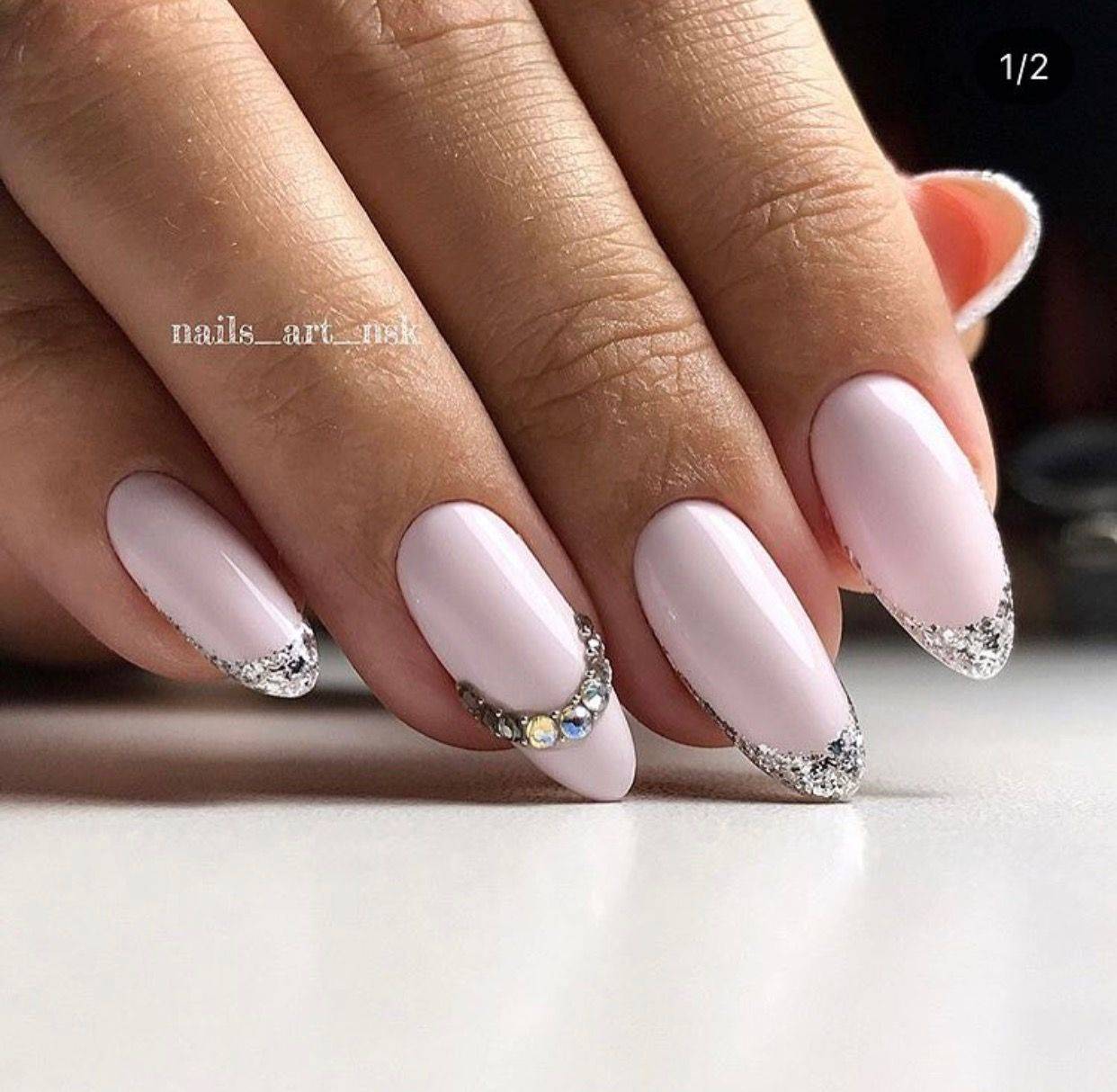 - Начиная от свободного края с рассеиванием к середине нанесите на ноготь серебряный глиттер.