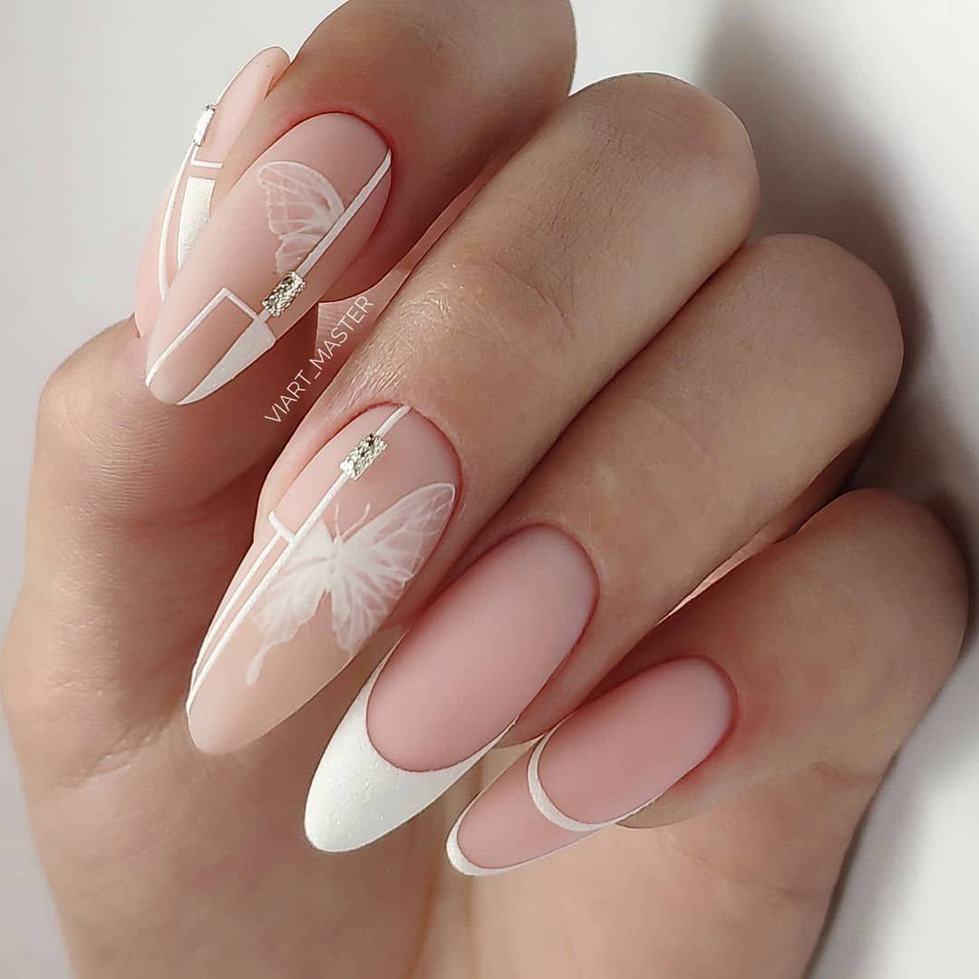 Соответственно пластину можно покрыть бежевым матовым лаком, а лунулу накрасить белым цветом. Этот маникюр можно сделать самостоятельно, но обязательно удалите кутикулу, придайте форму свободному краю и соскоблите птеригий. Ноготки должны смотреться идеально.