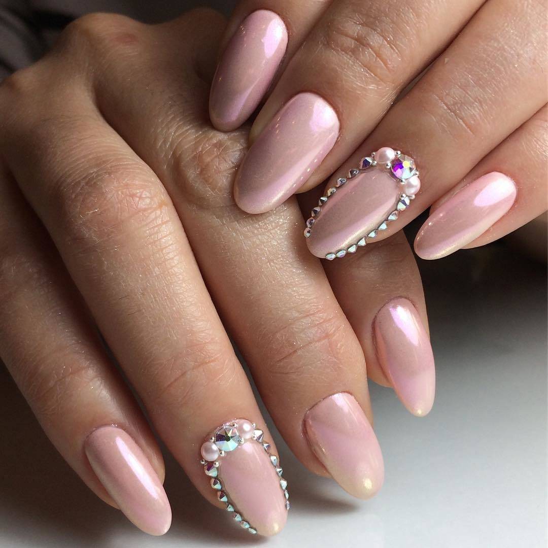 Редко какой маникюр на свадьбу обходится без страз или блёсток. Наряду с ними сейчас также популярен дизайн со слюдой, жемчуг и бульонки. Меняется только оформление ногтей.