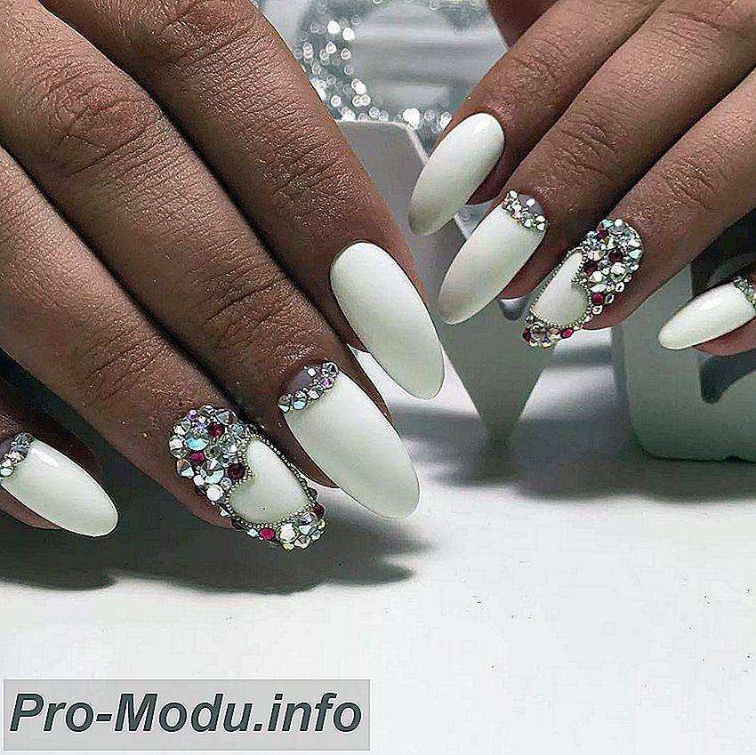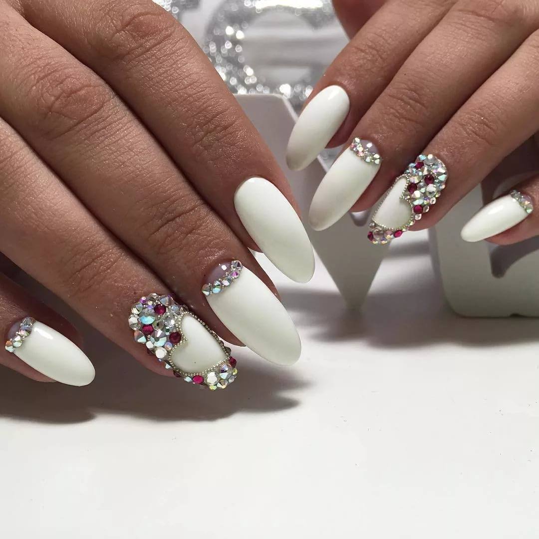 Освежить и разнообразить маникюр в белом исполнении можно при помощи переливающихся кристалликов. Если хочется получить нежный, легкий или романтический маникюр, то стильный белый дизайн с кокетливыми стразами станет самым утонченным и подходящим вариантом. Такой декор наиболее часто пользуется популярностью в выполнении свадебного дизайна. При помощи игривых кристаллов выделяют улыбочку французского маникюра или основание лунки, сочетают с объемными рисунками, выполняют легкие узоры. Таким способом можно смело воплотить в реальность все свои заветные мечты сказочного маникюра.