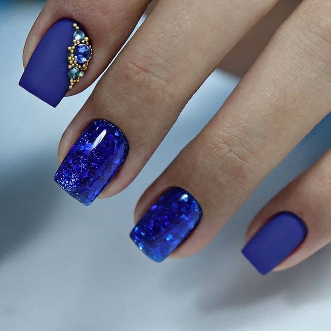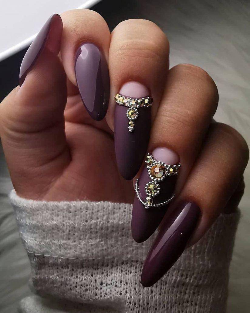 Модные тенденции в последние годы совмещают в себе объединение нескольких текстур – матовых и глянцевых. Комбинация этих двух элементов позволяет творить на ногтях настоящие шедевры. Объем и блеск страз создает невероятную игру света, а на матовом фоне он будет смотреться еще выгоднее.