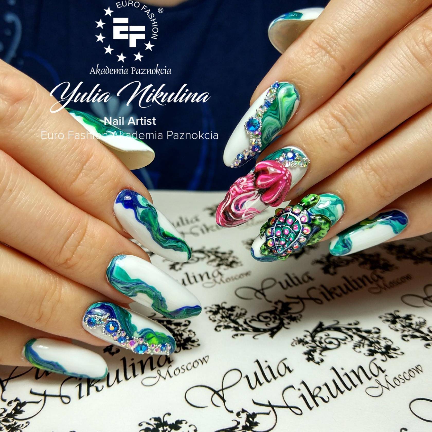 Узоры на ногтях мастер рисует с помощью тонкой кисточки. Работа поистине ювелирная, поэтому занимает длительное время