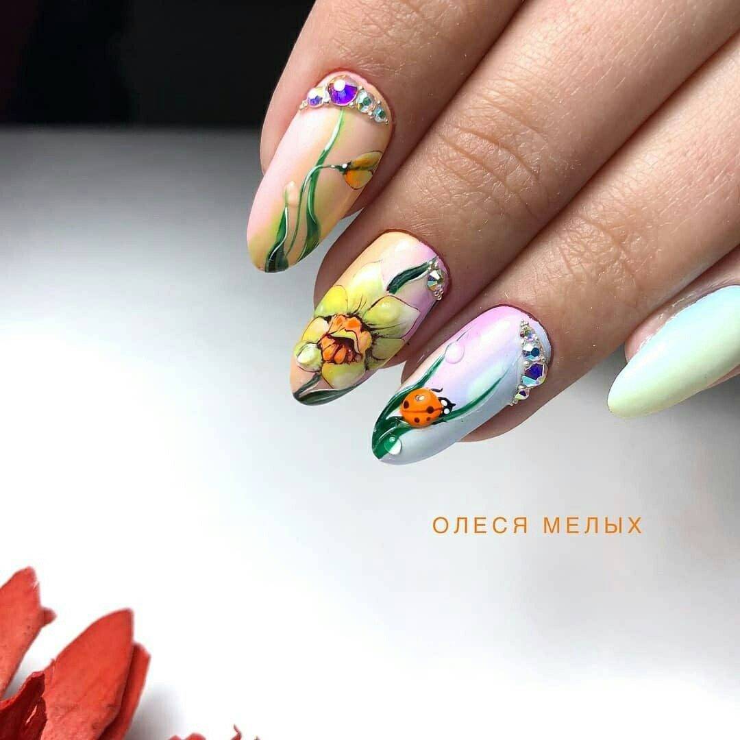 Существенное преимущество длинноватых ногтей – в способности создавать на их художественную роспись и уникальные принты, иногда имеющие сокрытый смысл. Маникюр с цветочными мотивами, узорчатым орнаментом, анималистическими рисунками отлично соседствуют с блестящими камушками, которые не просто украшают ноготок, да и являются частью композиции. Например, употребляются для выделения глазок животных, имитации росы и т.д.