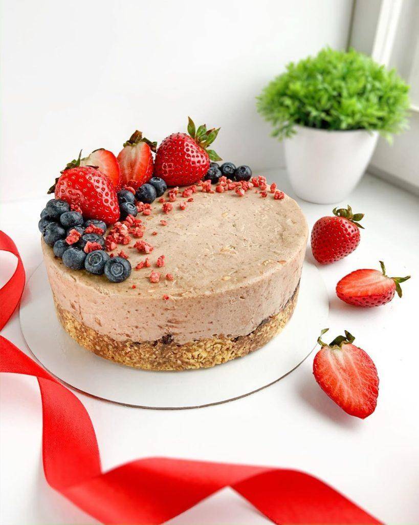 - Остаётся только украсить торт ягодами. Чаще других используются малина, черника, ежевика, брусника, клубника. Годится и вишня, в том числе коктейльная — вымоченная в сахарном сиропе, однако её нужно предварительно очистить от косточки.
