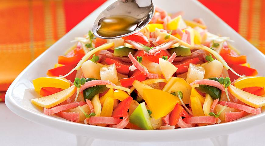 Если хочется накормить коллег чем-то ярким, аппетитным и сытным, но не пирогами, приготовьте салат с тамбовским окороком. Уверены, что все они придут к вам за рецептом этого блюда!