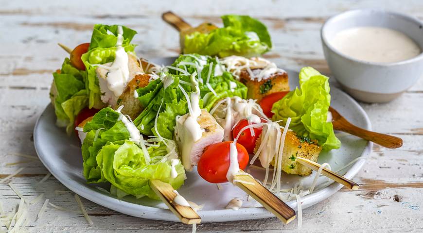 Закуска на шпажках на тему салата цезарь — быстрый и эффектный вариант популярного салата. Идеальное блюдо для фуршета или для приёма нежданных голодных гостей.