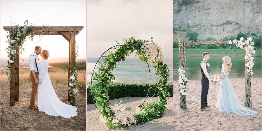 Выездные церемонии брака очень распространены в последние годы и на них главный атрибут – это, конечно, красивая свадебная арка. Если пару лет назад можно было встретить такой аксессуар, декорированный только цветами и тканью, то сегодня они бывают самыми различными, от классического цветочного варианта до шедевра, сделанного из дерева. Формы их тоже различаются, в 2021-ом будут в тренде: