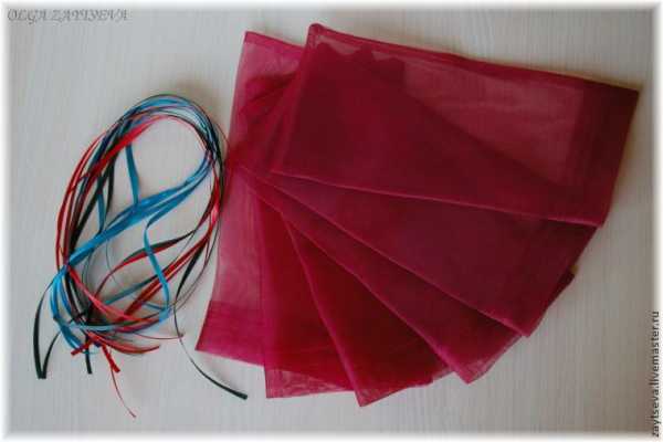 Итак, для 12 мешочков нам понадобится: органза (0,5 м), атласные ленточки (12 м), швейные нитки, ножницы, булавки. Для удобства вдевания ленточек — вязальный крючок.