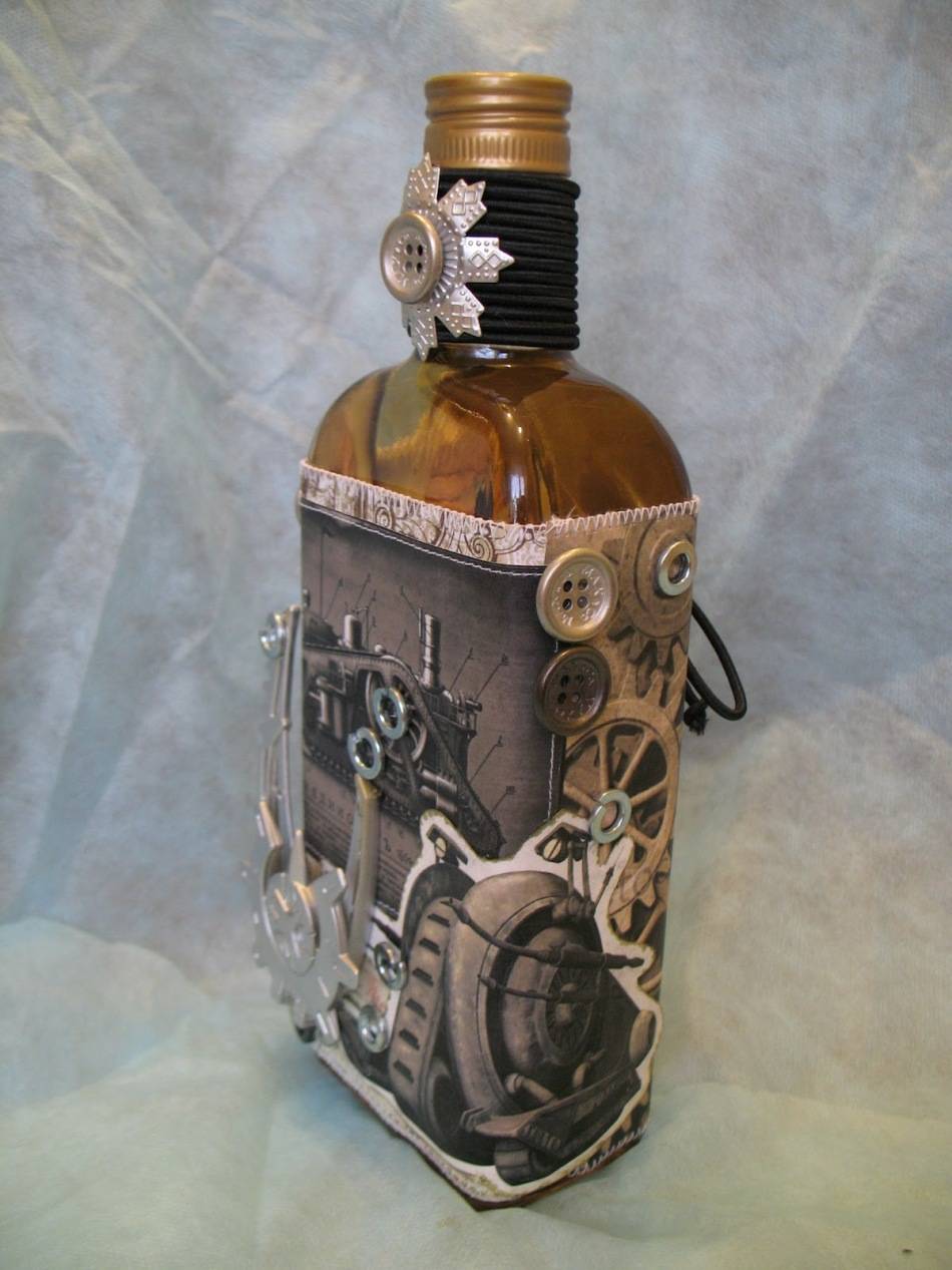 Не стоит думать, что дизайн для подарка мужчине не может быть ярким. Вот несколько примеров декупажа подарочной бутылки: