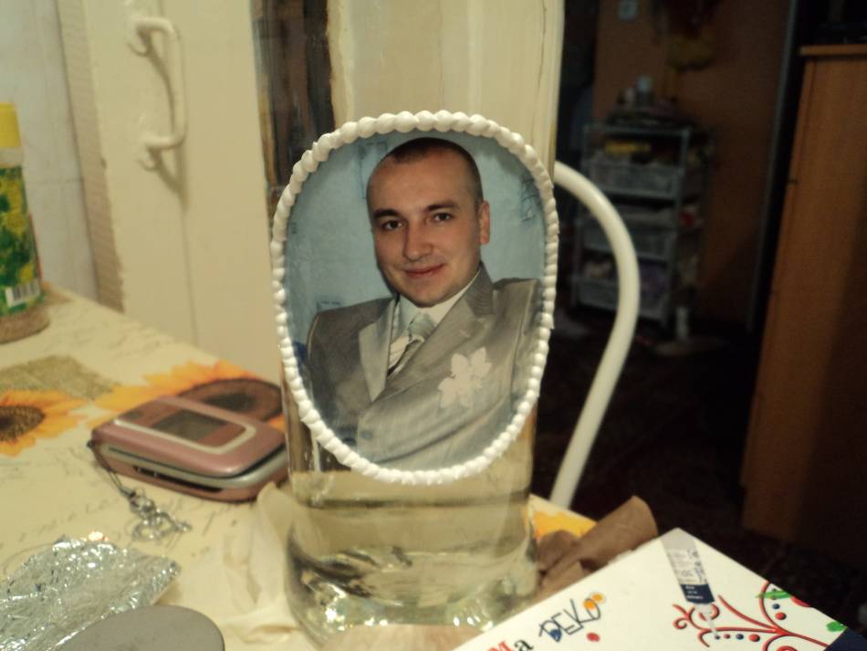 - Бутылка шампанского может украшаться фотографией молодоженов. Ее можно хранить даже после того, как напиток будет выпит. Для наклеивания подойдет не любое фото. Снимок должен быть четким, когда лица молодых хорошо видны. Желательно, чтобы жених и невеста на нем улыбались. Выбранный снимок можно отнести в специализированную организацию, где изображение переносят на самоклеящуюся пленку. Наличие липкого слоя позволяет легко приклеить картинку на стекло. Фото также можно печатать на бумаге и фиксировать на стекло прозрачным скотчем. Чтобы придать изображению торжественности, его обрамляют рамкой, добавляют слова поздравления, имена молодых и дату бракосочетания.