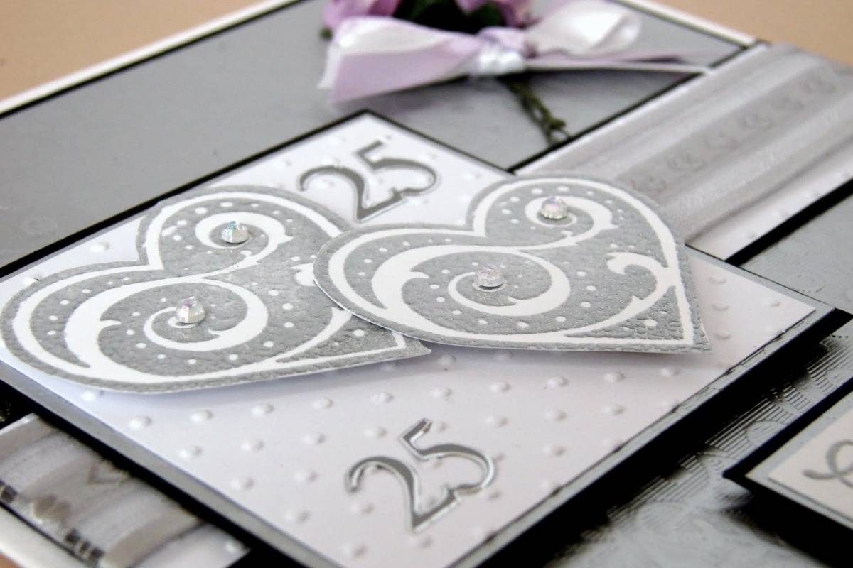 Поздравительная открытка с серебряной свадьбой будет хорошим дополнением к основному подарку. Как правило, на них изображают число 25, букет цветов, свечи, другие романтические элементы.