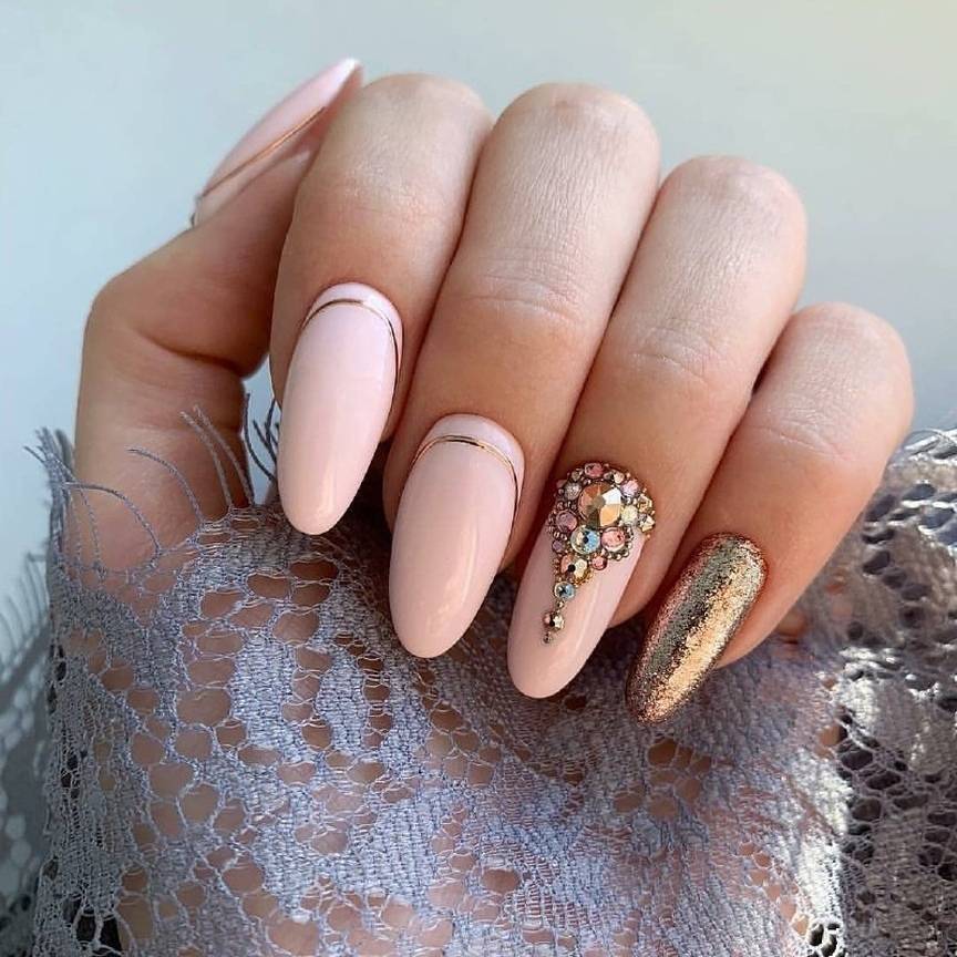 Отличный выбором для невест, которые хотят сиять в буквальном смысле этого слова, станут стразы, блестки, клепки. Некоторые из фотографий свадебного маникюра ниже просто поражают своей роскошью и великолепием, другие притягивают взгляд изящной скромностью. Блестящие камушки лучше всего смотрятся на средних и длинных ногтях, в модных сейчас нюд и пастельных тонах.