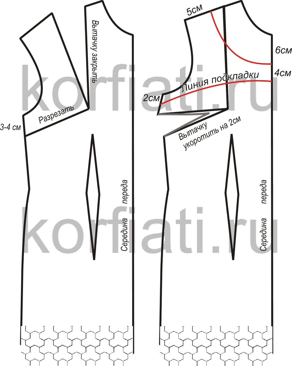 Вырез горловины переда углубить на 6см. От плеча отложите 5см. По лекалу проведите новую линию выреза горловины.