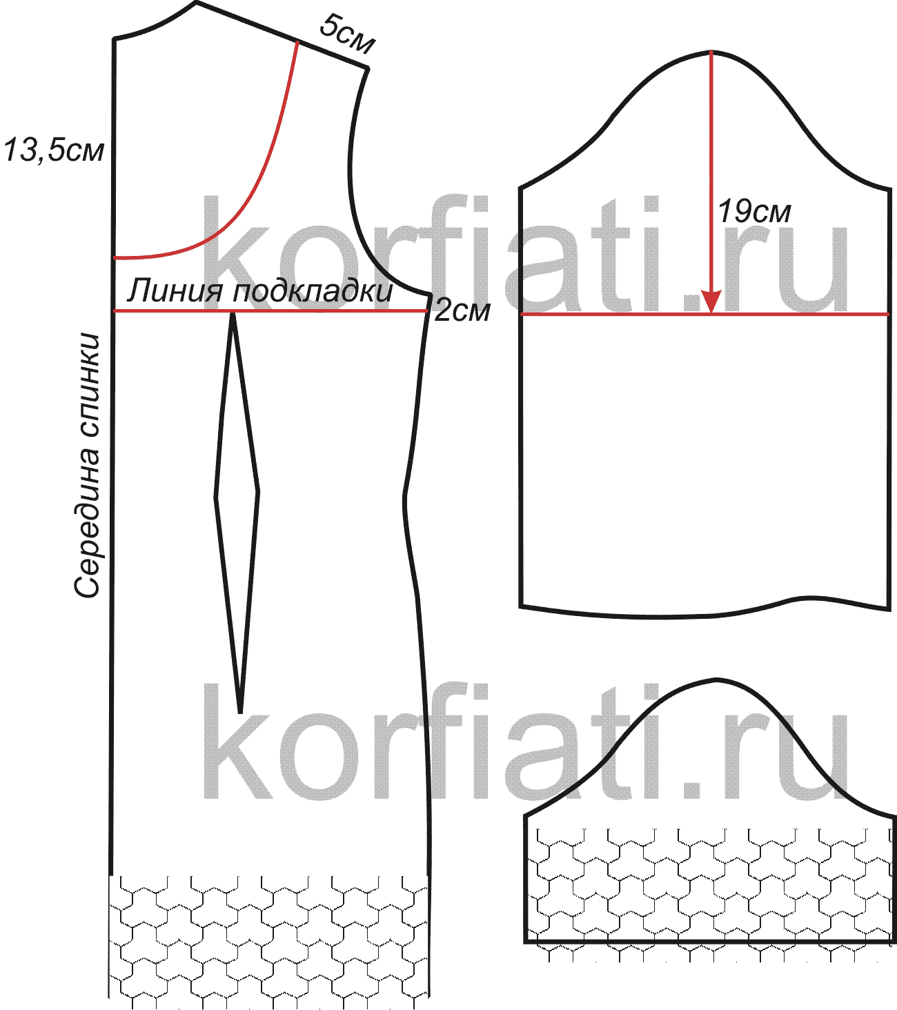 Подкладка спинки платья. Подкладка спинки платья кроится по выкройке спинки. Для моделирования линии верха подкладки отложите от проймы по боку вниз 2см и проведите горизонтальную линию.