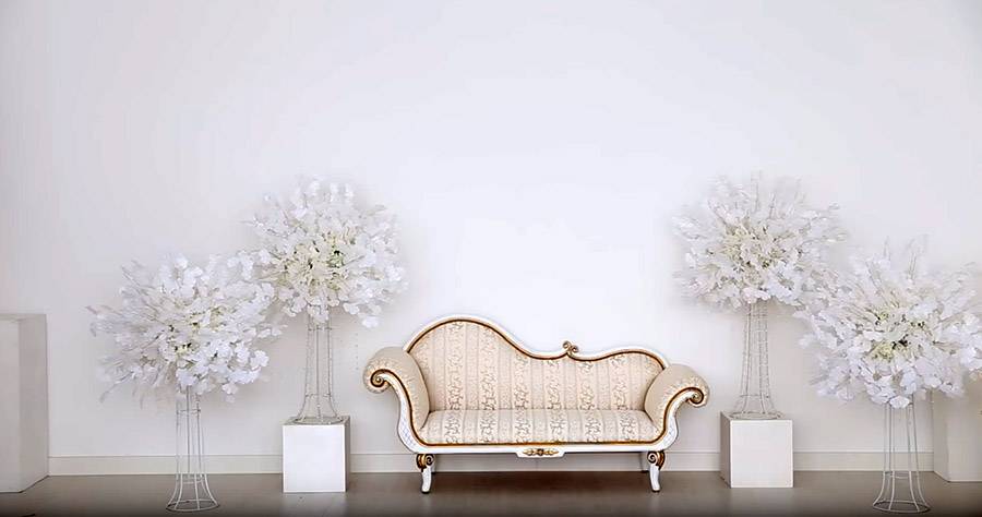 Огромные цветы делают из бумаги, картона, ткани, и смотрятся они очень эффектно! Советуем рассмотреть варианты фотозоны на свадьбу с большими цветами, стоящими на стеблях или украшающими стену (задник). Можно ничего больше не использовать: локация будет выглядеть оригинально за счет необычных украшений. При желании можно добавить мебель – кресла или диван – в тон цветам. Тогда локация для съемки обретет целостность и концептуальность по цвету.
