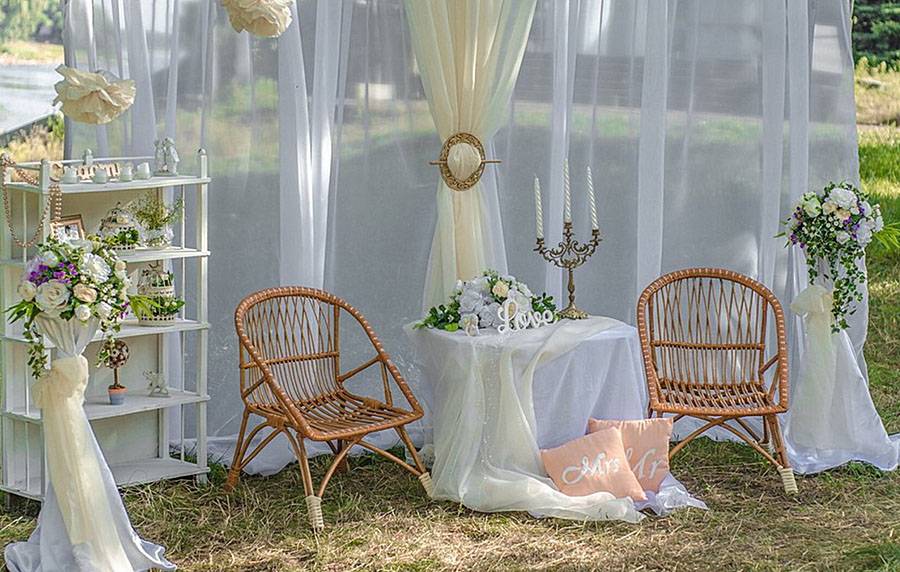 Если свадьба проводится на природе – очень гармонично будет выглядеть фотозона на фоне естественных пейзажей. Живописность природы можно подчеркнуть дополнительными атрибутами, например, фотозона в лесу на свадьбу может быть дополнена подвесными качелями на ветвях деревьев, беседкой, креслами, гамаками. Не забываем и о декоре живыми цветами. Если выбрана водная тематика на берегу водоема – можно оформить фотозону лодкой в окружении камышей, для морского пейзажа подойдут настоящие морские камушки, ракушки, декоративные обитатели соленых просторов: морские звезды, рыбки, морские коньки.