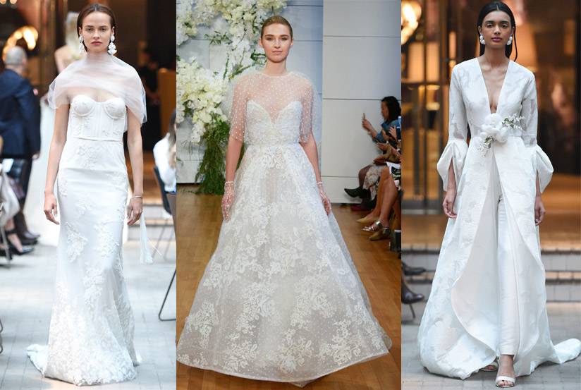 Россыпи вышитых цветов, аппликации и орнаменты придают современным свадебным нарядам необычайную игривость и свежесть. Monique Lhuillier и Zuhair Murad декорировали невесомое шифоновое поле флористической вышивкой, а дизайнеры Naeem Khan сделали ставку на аппликационный декор.