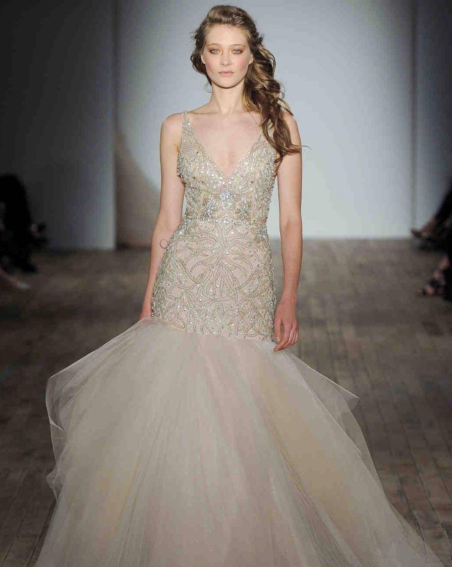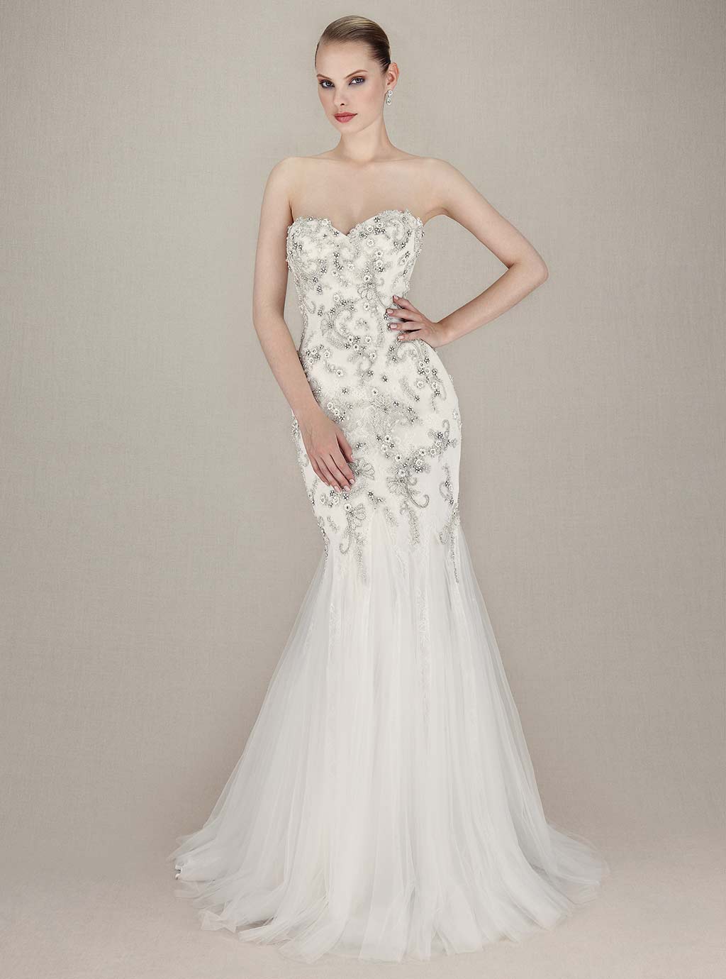 Сверкающие стразы, которые долгое время оставались вне моды, резко ворвались в ряды фаворитов! Эффект от кристаллов, нашитых на прозрачную шифоновую ткань, просто головокружителен. Особенно, если дело касается минималистичных фасонов, как у Inbal Dror и Zuhair Murad. Кроме того, обильное применение страз на прозрачных лифах дает дизайнерам возможность перевести неприкрытую откровенность в разряд таинственно мерцающей загадочности, что, безусловно, прибавляет очков к очарованию девушек.